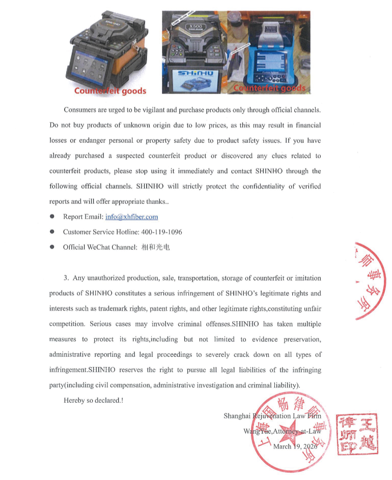 Declaración de un abogado sobre la falsificación de la empalmadora de fusión de fibra SHINHO X-500 en el mercado pakistaní.